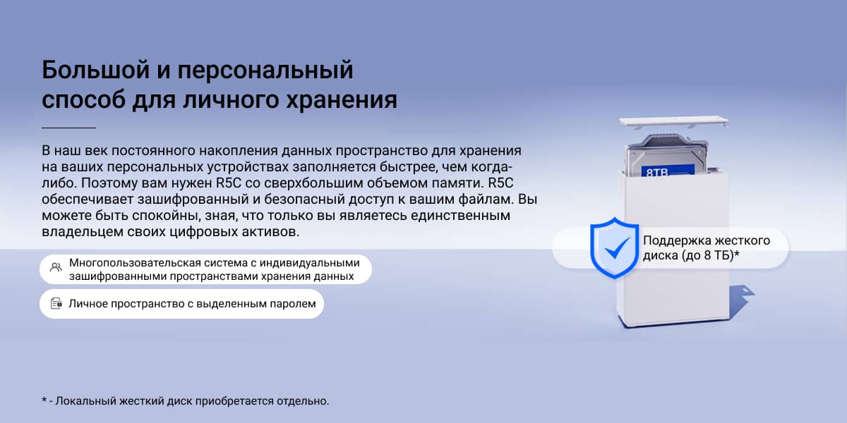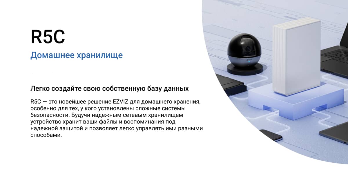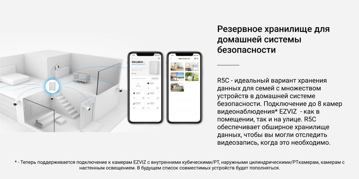 EZVIZ R5C — компактное локальное хранилище и регистратор для домашних и малых офисных систем видеонаблюдения. Устройство рассчитано на подключение до 8 камер EZVIZ, поддерживает установку одного 3,5" SATA-HDD ёмкостью до 8 ТБ, обеспечивает непрерывный доступ к записям и воспроизведение за весь день.