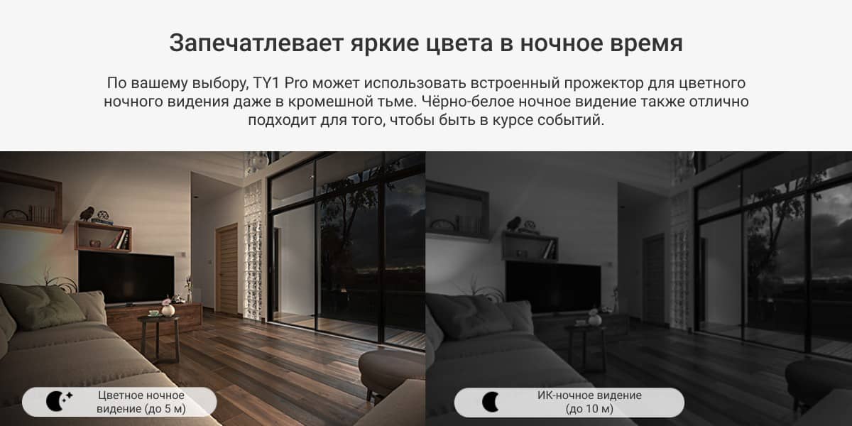 Ночная съёмка реализована в двух режимах: цветное ночное видение при включённом встроенном прожекторе и чёрно-белое ИК-видение. Заявленная дальность цветного режима до 5 метров, ИК-режима до 10 метров; переключение режимов автоматическое в зависимости от освещённости. Это даёт читаемую картинку в типичных комнатах и возможность различать лица ночью в пределах комнаты.
