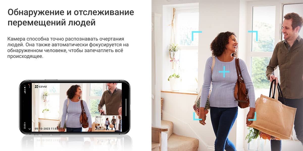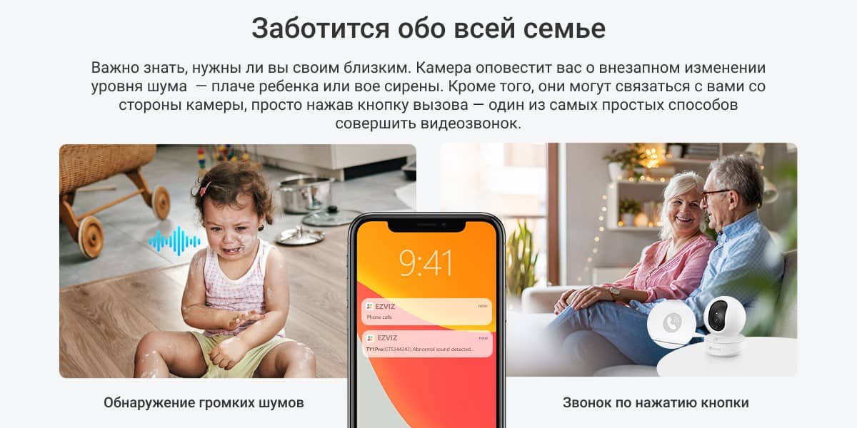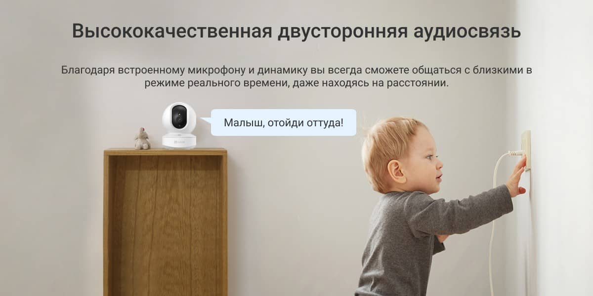Интеллект: авто-трекинг движущихся объектов, распознавание человеческого силуэта и обнаружение «громкого звука» — камера фильтрует события по типу и снижает поток ложных уведомлений. Двусторонняя аудиосвязь и сенсорная кнопка вызова для мгновенной связи с членами семьи или проверки ситуации в комнате.