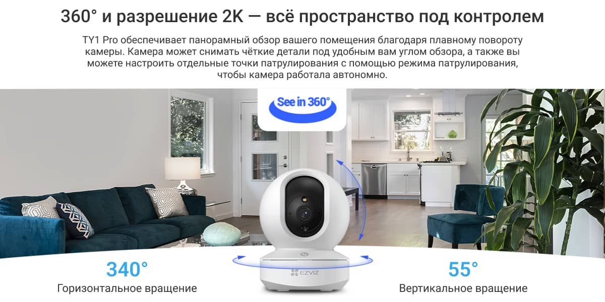EZVIZ TY1 Pro 2K — панорамная поворотно-наклонная камера для контроля помещений с акцентом на детальность и автономную работу. Разрешение до 2304×1296 пикселей, кодеки H.265/H.264 и поддержка microSD до 512 ГБ дают возможность получать более насыщенную картинку и хранить длительные фрагменты при ограниченной пропускной способности сети.