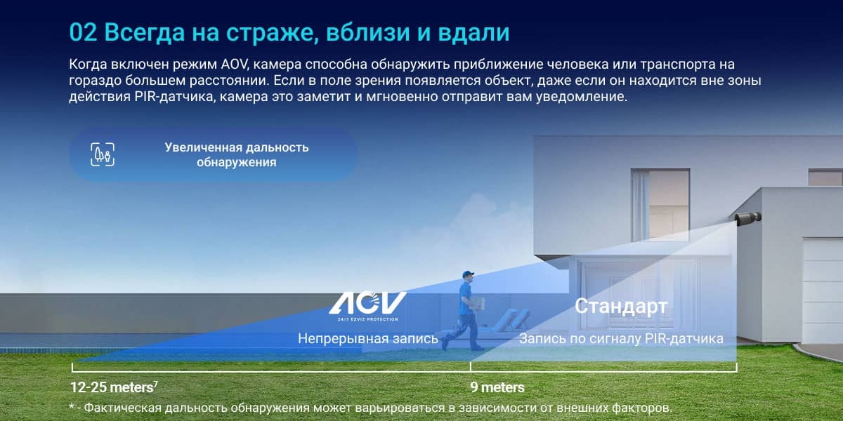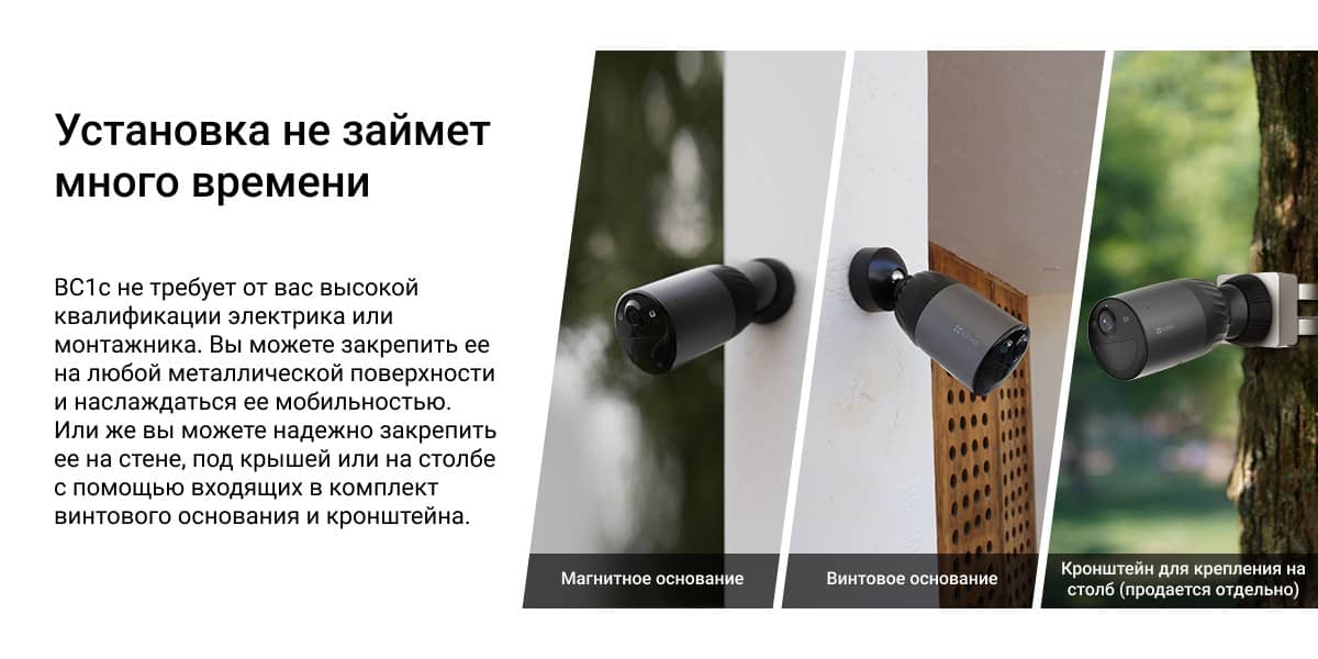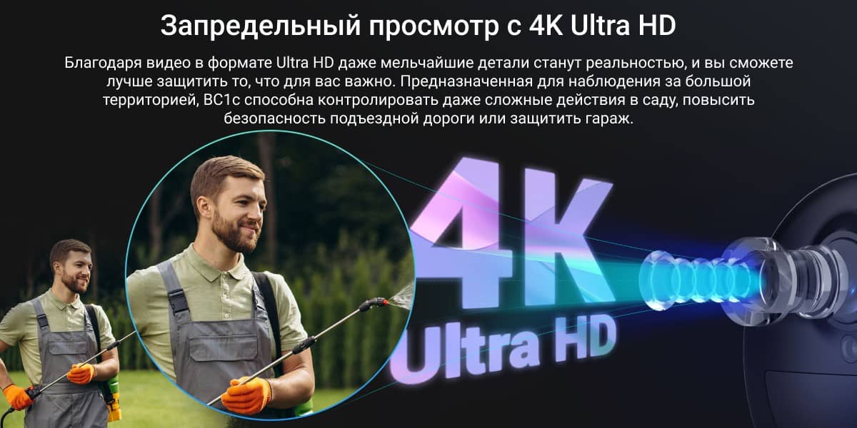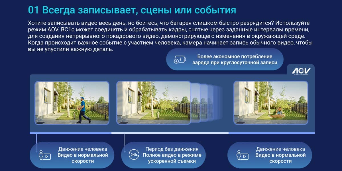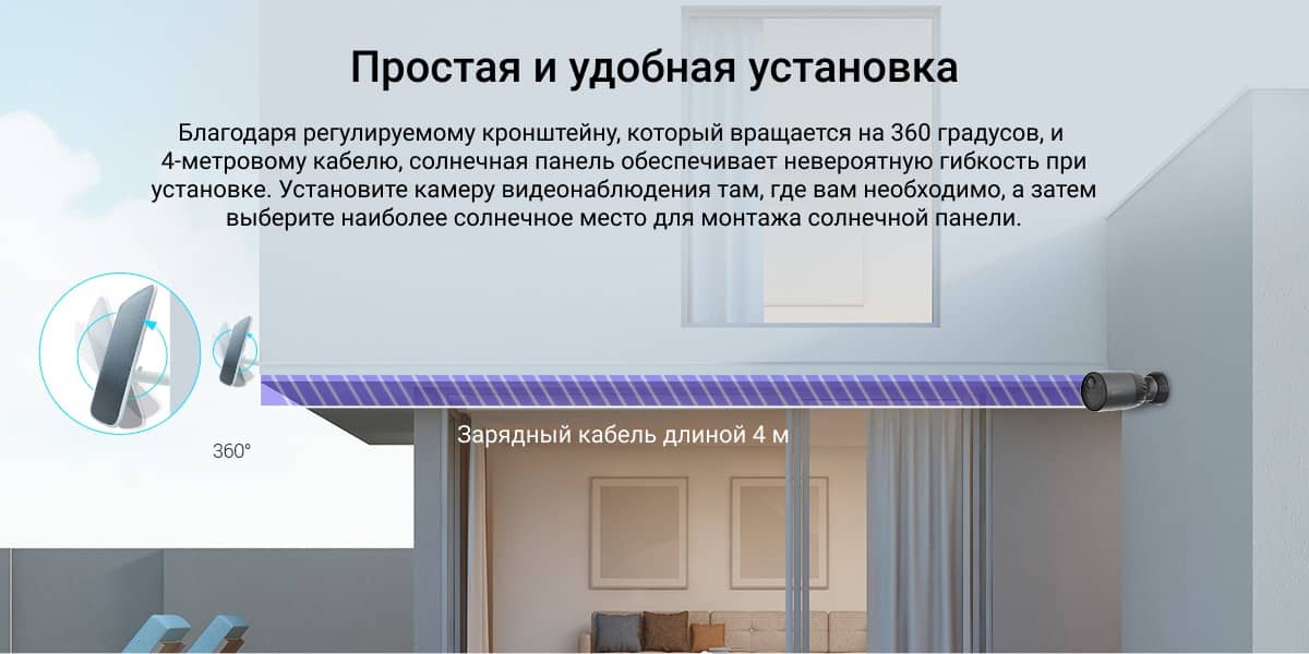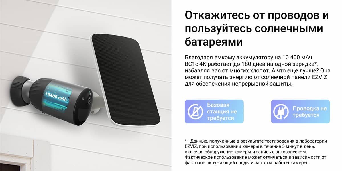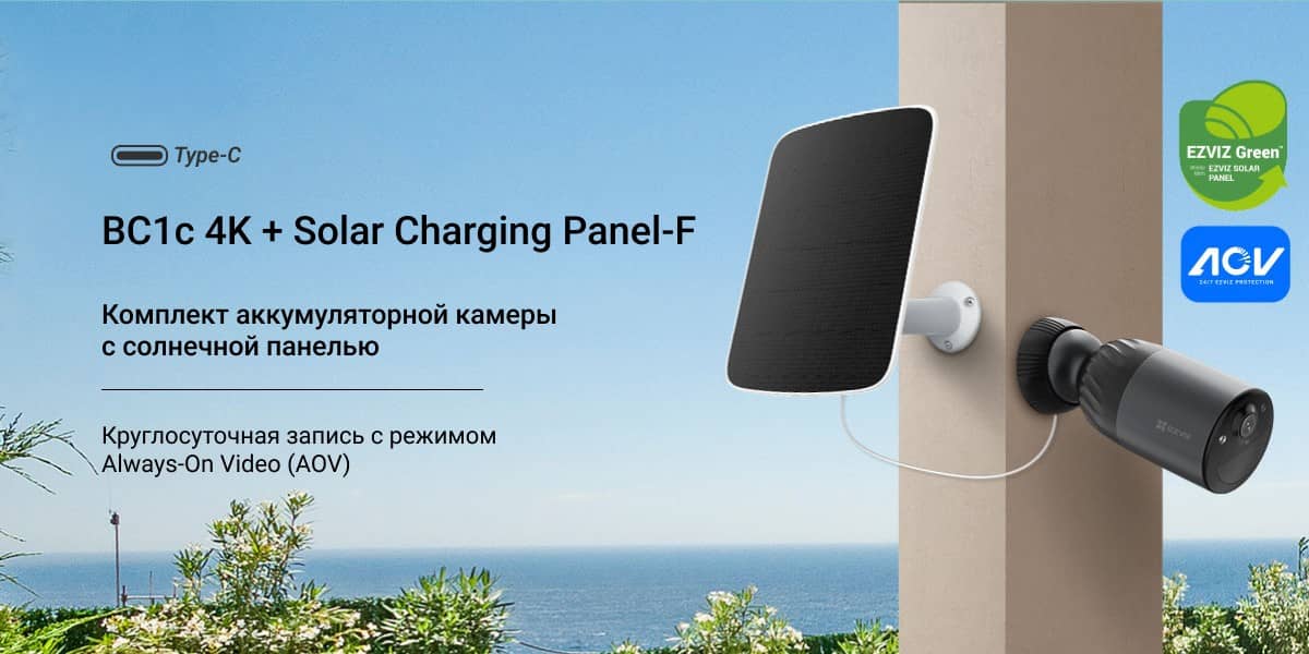 Умная четкость в 4K. Надежная защита и не только. Комплект BC1c с солнечной панелью создан для обеспечения долгосрочной наружной безопасности с минимальными усилиями. Он избавляет вас от сложной прокладки кабелей питания и ограничений при выборе места установки, дополняя высокопроизводительную аккумуляторную камеру высокоэффективной солнечной панелью. Помимо непревзойденной четкости 4K, широкого функционала, проверенной долговечности и экологичности, камера также оснащена уникальным режимом EZVIZ «Always-On-Video» (AOV) для автоматической защиты в режиме 24/7.