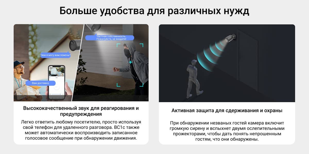 Может включать в себя сирену и встроенные прожекторы, которые автоматически срабатывают при обнаружении подозрительной активности. Это помогает отпугнуть злоумышленников и повысить уровень безопасности вашей территории.