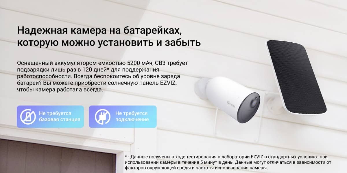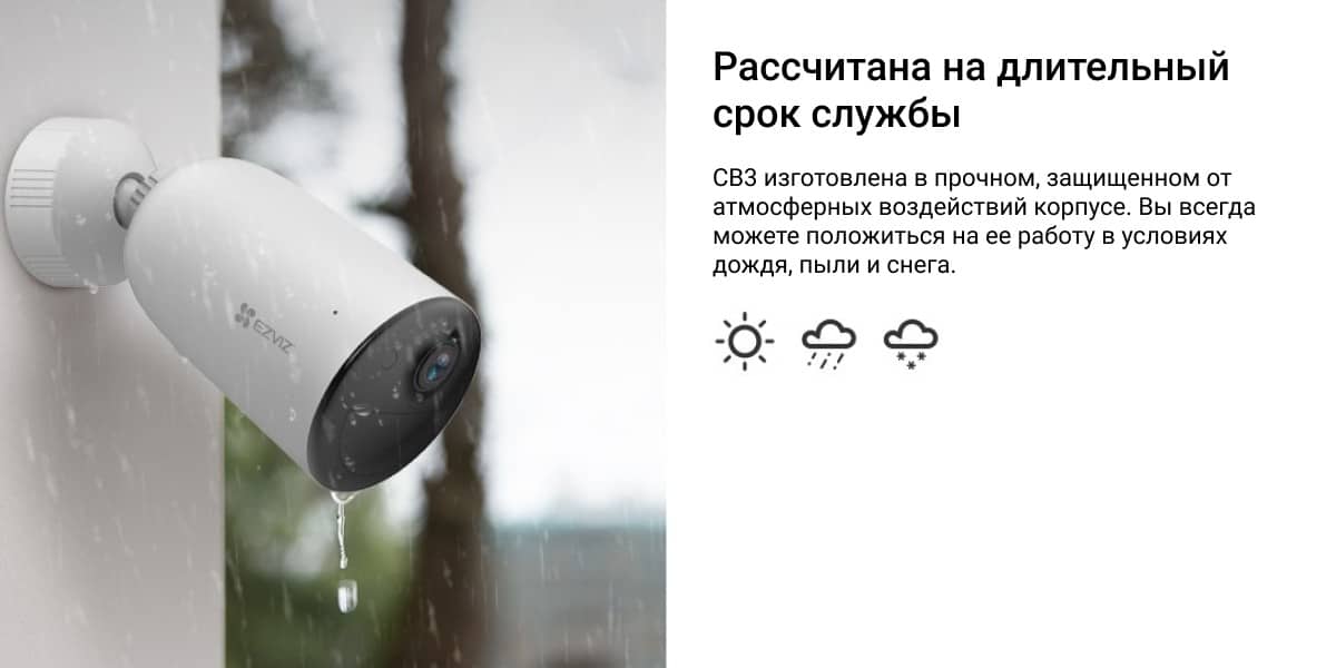 EZVIZ CB3 выделяется уверенной детализацией днём и ночью, устойчивой работой от аккумулятора и полноценным набором функций безопасности. Модель подходит для тех, кому важно получить широкое покрытие, стабильную съёмку в сложном освещении и надёжность в уличных условиях без необходимости прокладывать кабели питания.
