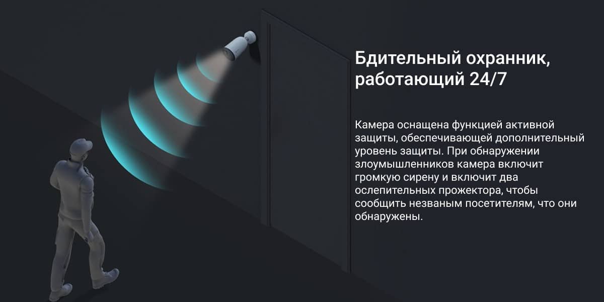 Интеллект и активная защита включают ИИ-распознавание формы человека, локальную двухстороннюю аудиосвязь, воспроизведение предзаписанных голосовых сообщений, сирену и прожектор для сдерживания нарушителей. Подключение по Wi-Fi 2.4 ГГц, локальное хранение — microSD до 256 ГБ. Корпус IP65, рабочий диапазон температур от −20 °C до +50 °C позволяют эксплуатировать камеру на улице в стандартных климатических условиях.