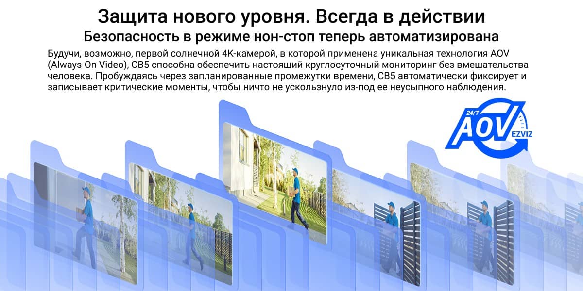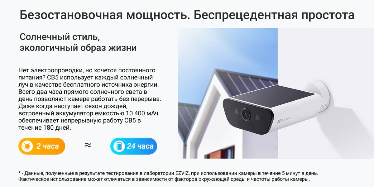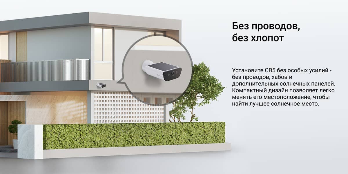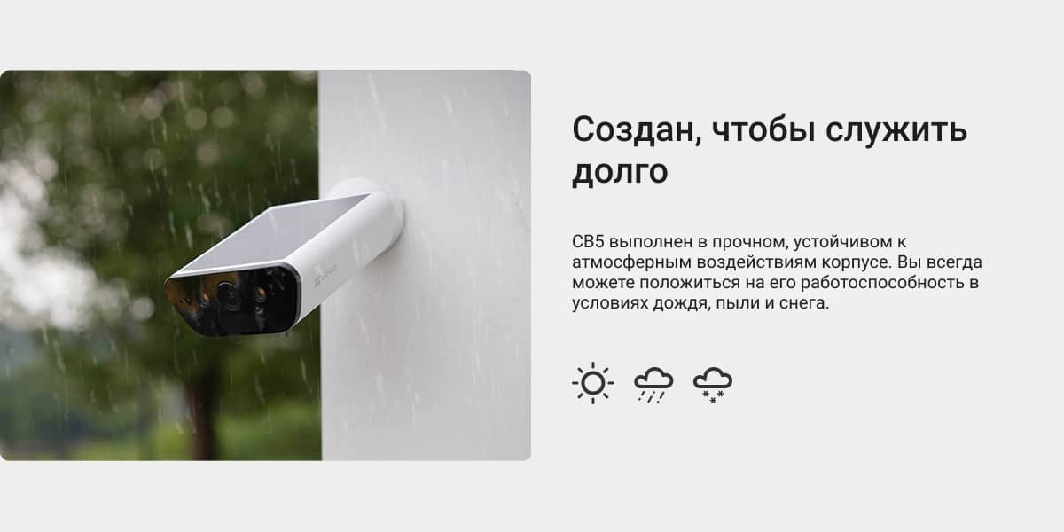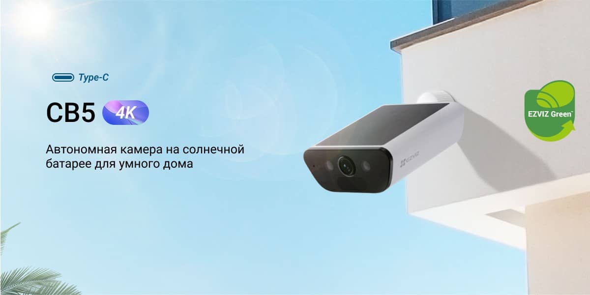 EZVIZ CB5 — уличная солнечная аккумуляторная камера с 4K-разрешением и режимом «Always-On», рассчитанная на длительную автономную работу и точную детекцию движущихся объектов. Она предназначена для наблюдения периметра участка, подъезда или двора с требованием к высокой детализации и минимальному обслуживанию.