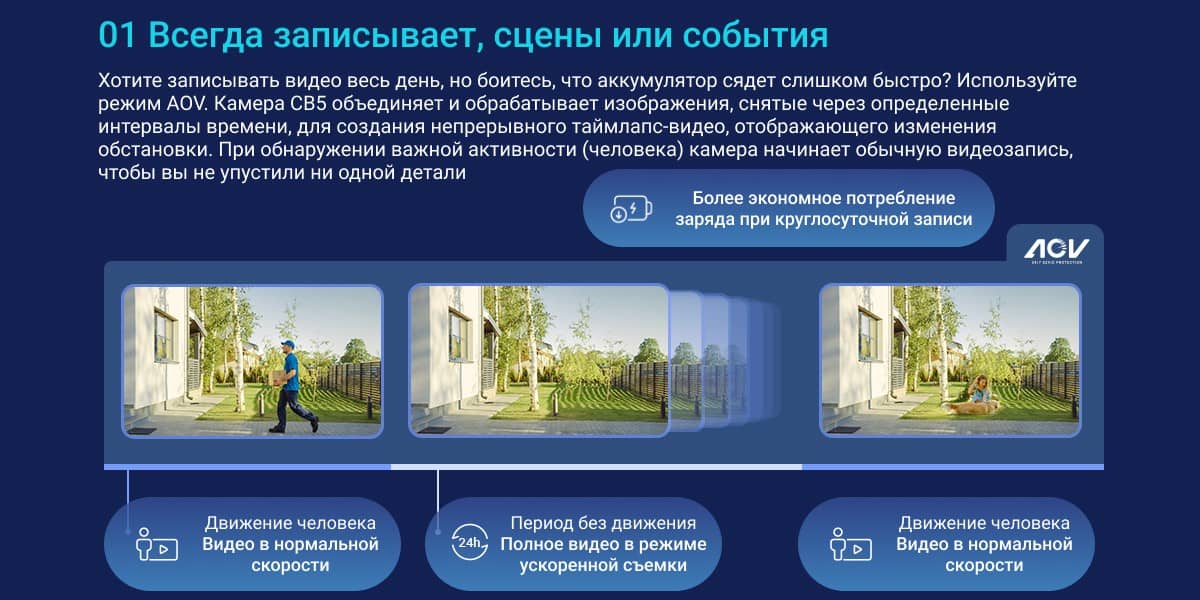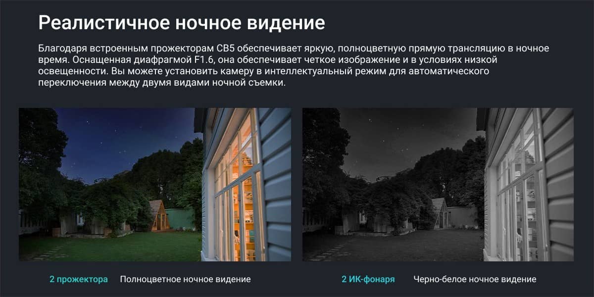 Для ночной съёмки доступны два прожектора для цветной картинки и инфракрасные светодиоды для ч/б режима дальностью до 15 м. Встроенные прожекторы и сирена работают в режиме активной защиты. AOV-режим комбинирует тайм-лапс и нормальную запись, что позволяет продлить время автономной работы при сохранении важных событий.