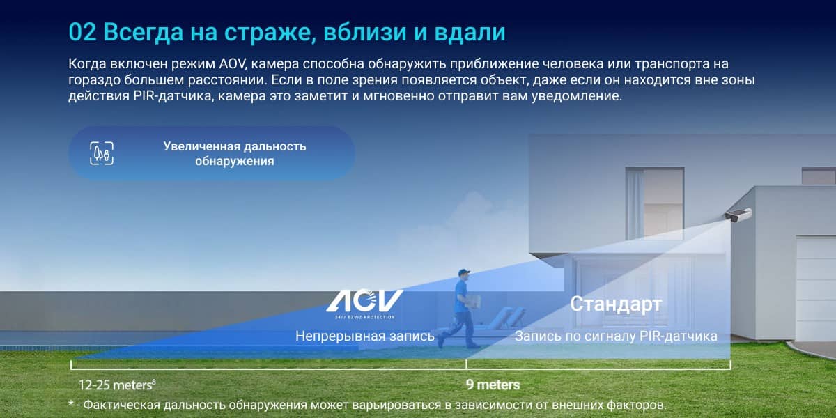 Встроенные ИИ-алгоритмы различают людей и автомобили, снижают количество ложных уведомлений, заявленная дальность детекции в AOV достигает 25 м днём и 12 м ночью. Локальное хранение поддерживает microSD до 512 ГБ, интерфейс связи — Wi-Fi 6 (802.11ax) в диапазоне 2.4 ГГц. Корпус соответствует IP65, рабочий диапазон температур от -20 до +50 °C.