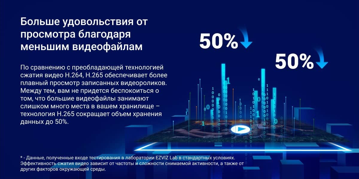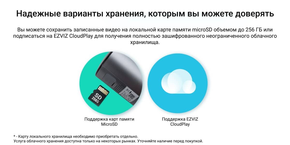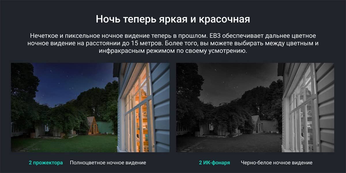 Камера поддерживает цветное ночное видение при включённых прожекторах и чёрно-белый ИК-режим, рабочая дальность обоих режимов до 15 м. Хранение осуществляется через microSD до 256 ГБ, кодек H.265 даёт повышенную четкость деталей при умеренной нагрузке на сеть и объеме локальных записей.