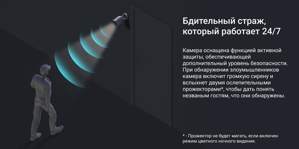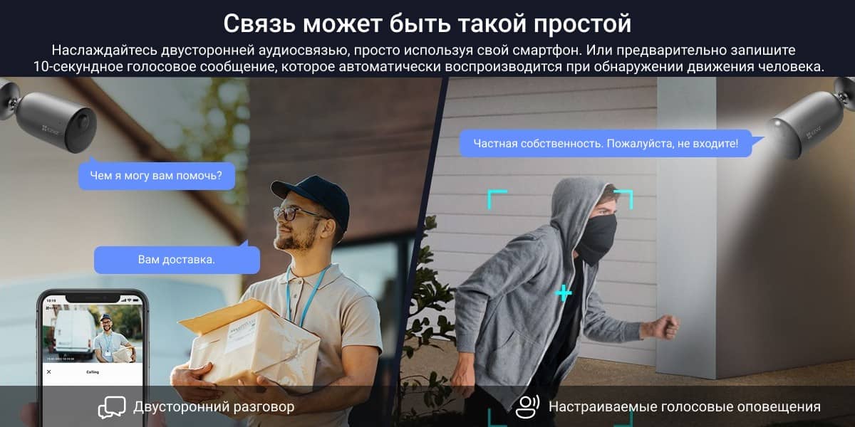 ИИ-детекция формы человека для снижения ложных тревог, настраиваются зоны детекции и активная защита — сирена и стробоскоп и настраиваемые голосовые — дают возможность реагирования на инциденты в реальном времени. Двухсторонняя аудиосвязь оповещения облегчает проверку ситуации без выезда на место.