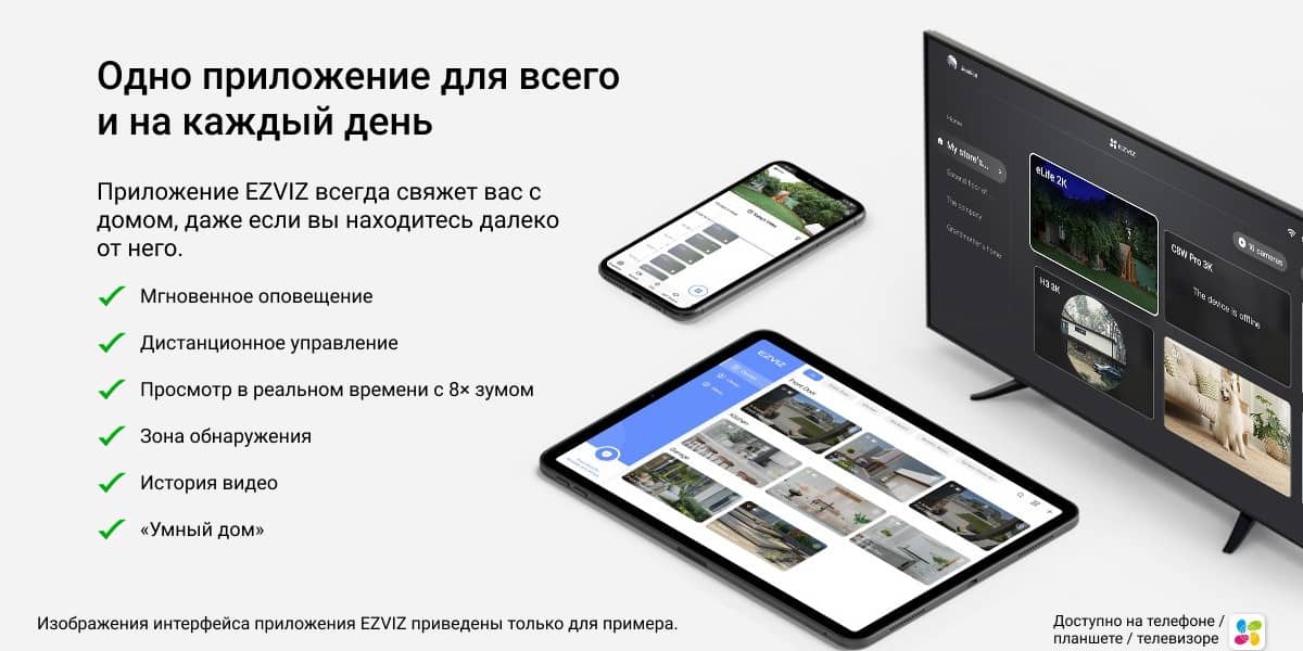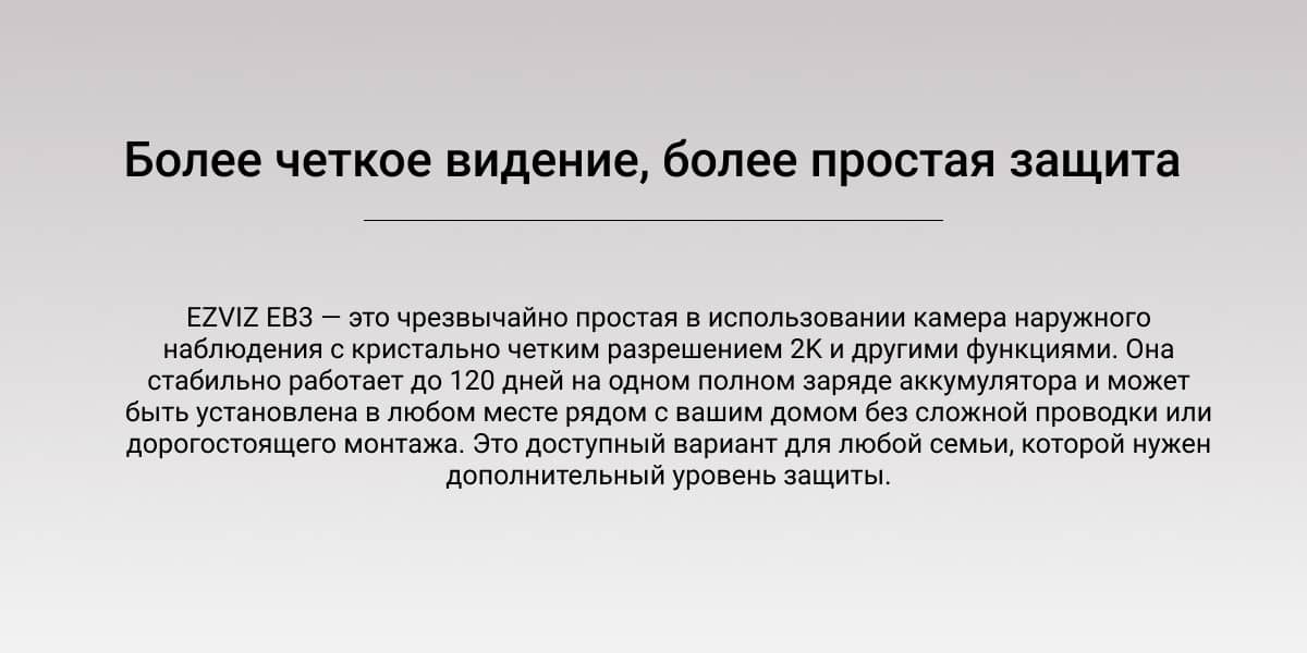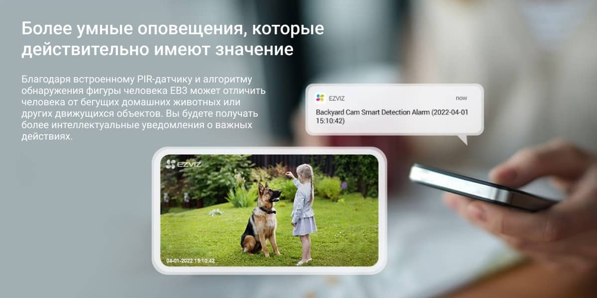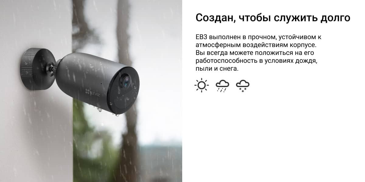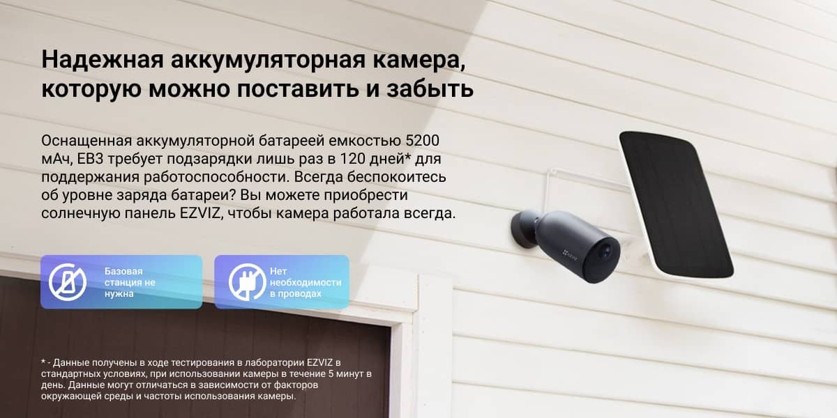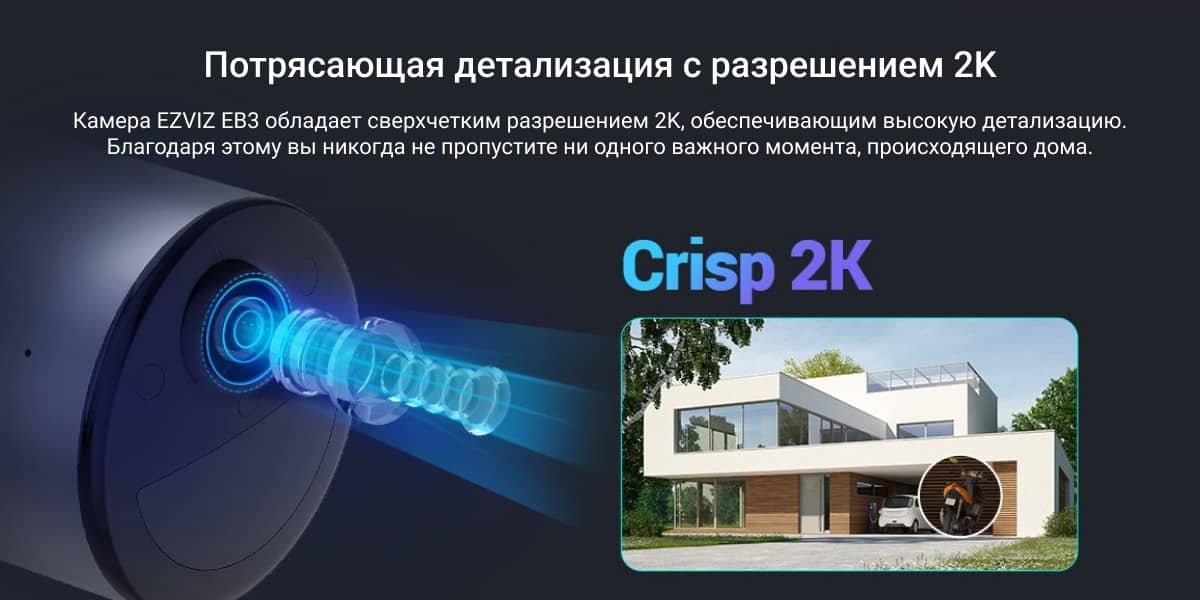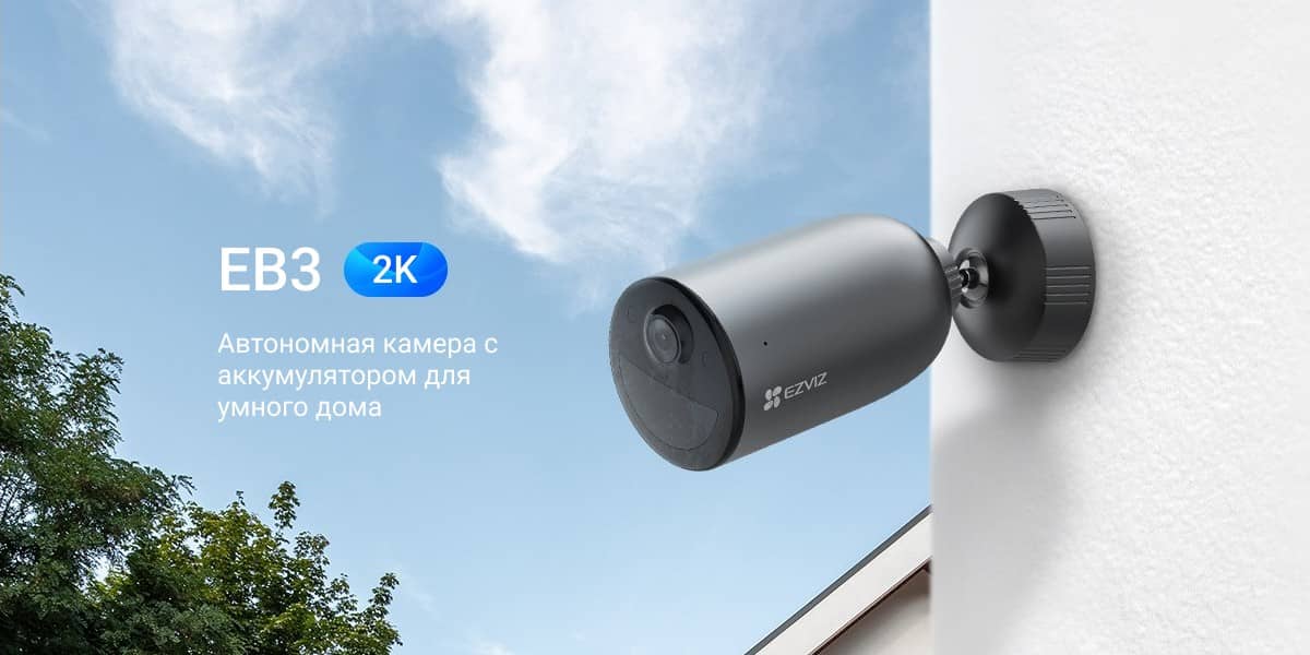 EZVIZ EB3 — уличная автономная аккумуляторная камера с упором на длительную работу и информативную съёмку в 2K-разрешении. Видео 2304×1296 (2K) пикселей, объектив 2.8 мм при F2.0 с диагональным углом обзора 131°, адаптивная частота до 15 к/с.