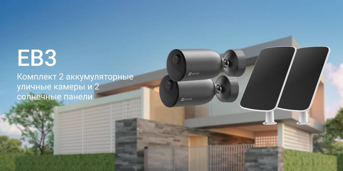 Комплект 2 уличные IP камеры EZVIZ EB3 3 Мп (2,8 мм) с 2 солнечными панелями сочетает передовые технологии видеонаблюдения с возобновляемой энергией. EB3 — полностью беспроводная перезаряжаемая камера, обеспечивающая всестороннюю наружную защиту. Ее можно просто установить в любом месте для повышения безопасности. Камера унаследовала основные технологии EZVIZ: цветное ночное видение, двустороннюю связь, активную защиту и многое другое. Уникальной особенностью данного комплекта является использование солнечных панелей для питания камер. Две высокоэффективные панели, входящие в комплект, преобразуют энергию солнца в электричество, обеспечивая автономную работу системы видеонаблюдения без необходимости подключения к сети.