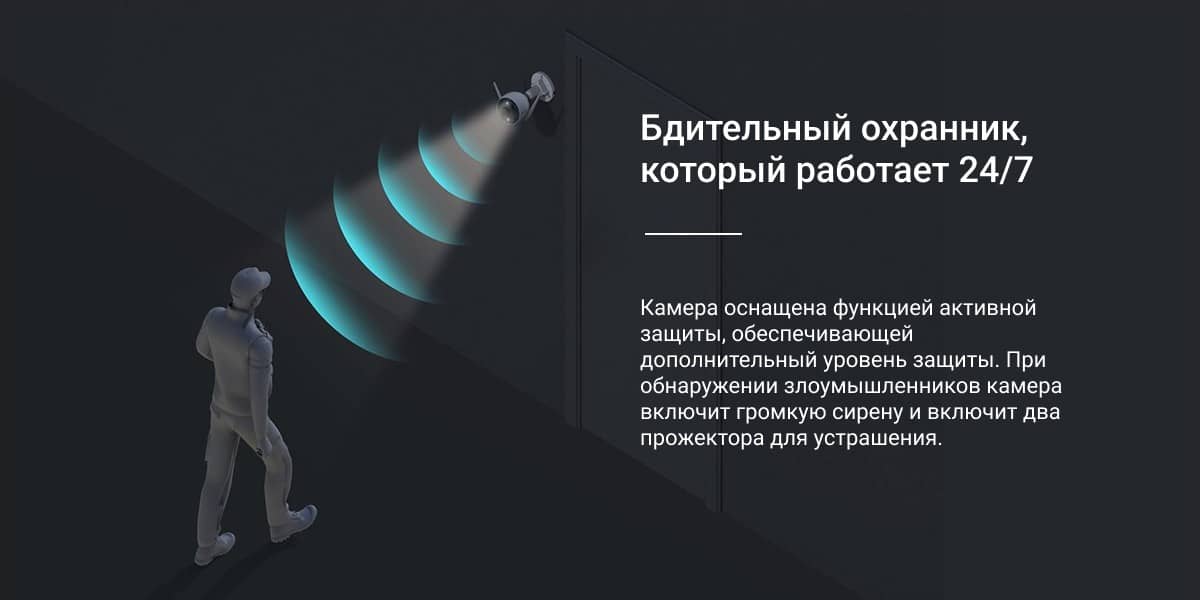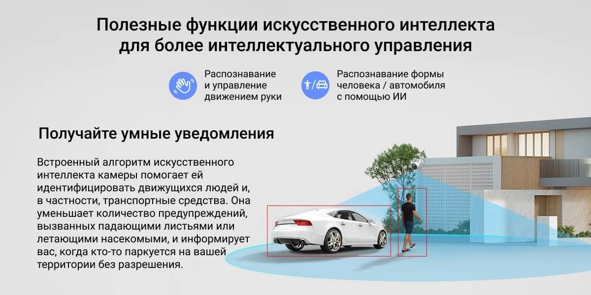 Функционально камера предоставляет ИИ-детекцию человека и транспорта, настраиваемые зоны тревоги, двухстороннюю аудиосвязь, активную защиту со стробоскопом и звуковой сигнал с записанными голосовыми оповещениями.