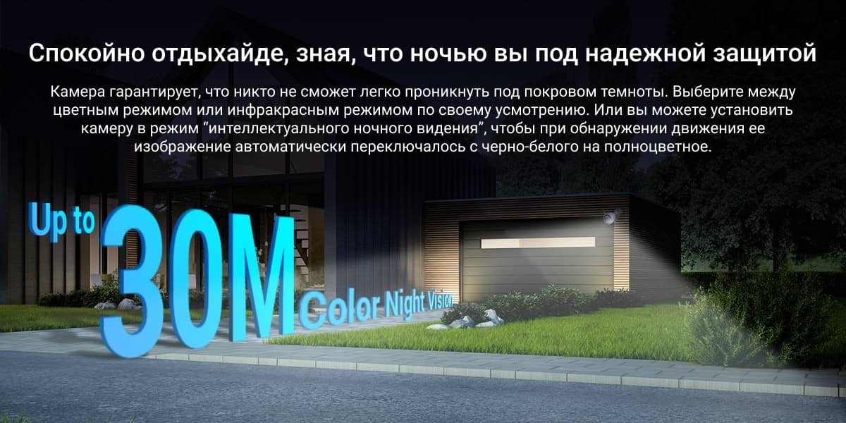 Ночная съёмка реализована в двух режимах: цветное ночное видение при включённых белых прожекторах и чёрно-белая ИК-съёмка дальностью до 30 м. Минимальная освещённость 0,01 люкс (F2.0, AGC ON). Цифровой WDR и 3D-DNR улучшают читаемость сцен с яркими и тёмными участками, снижая пересветы и шумы при сложном освещении.