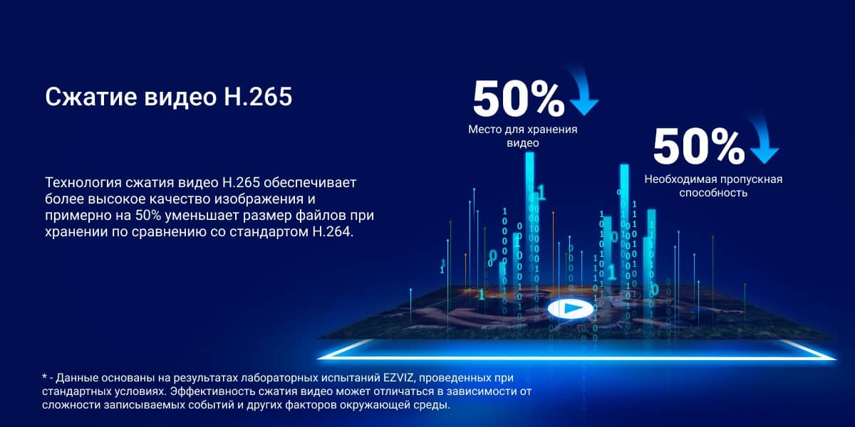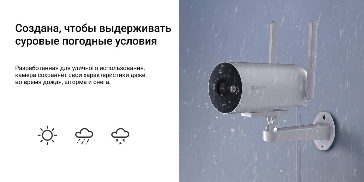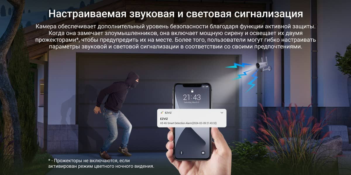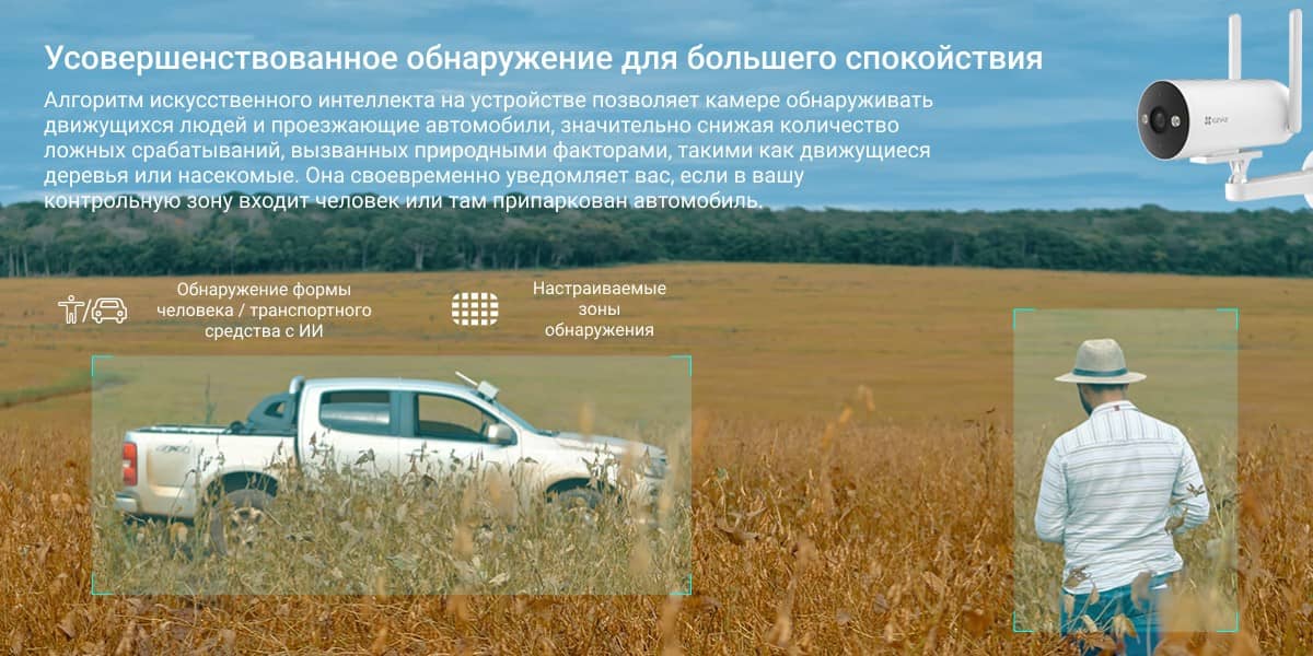 Алгоритмы видеонаблюдения включают встроенное ИИ-распознавание формы человека и транспортного средства, что помогает снизить количество ложных тревог, вызванных движением листьев, животных или освещением. Функции активной защиты предусматривают встроенную сирену и два прожектора, которые включаются при обнаружении вторжения. Камера рассчитана на эксплуатацию в диапазоне температур от -30 °C до +50 °C, класс защиты корпуса IP67 — соответствует условиям наружной установки под открытым небом. Локальное хранение реализовано через слот microSD до 512 ГБ.