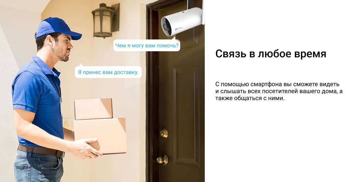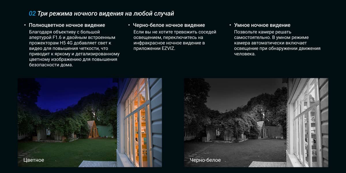 Оптика камеры рассчитана на разрешение до 2304×1296 пикселей, что соответствует формату 2K. Объектив фиксированный: 4 мм, диафрагма F1.6, угол обзора по диагонали 102°, по горизонтали — 86°. Ночное наблюдение реализовано с тремя режимами: цветное ночное видение (с двумя встроенными прожекторами), чёрно-белое ИК-видение на расстоянии до 30 метров и «умный» режим, при котором смена режима происходит автоматически при обнаружении человека.