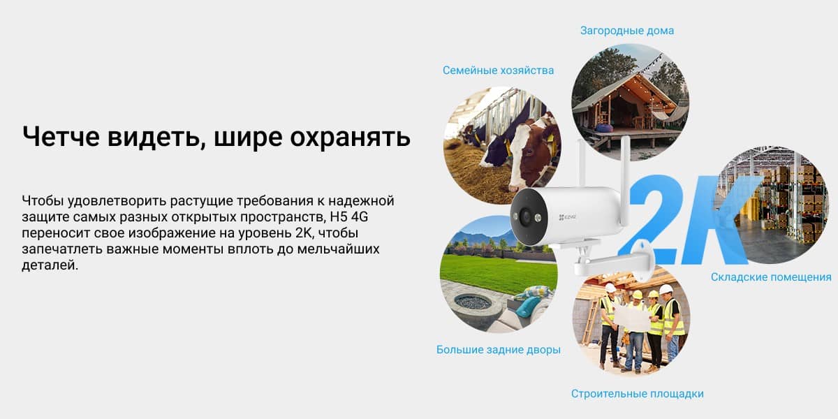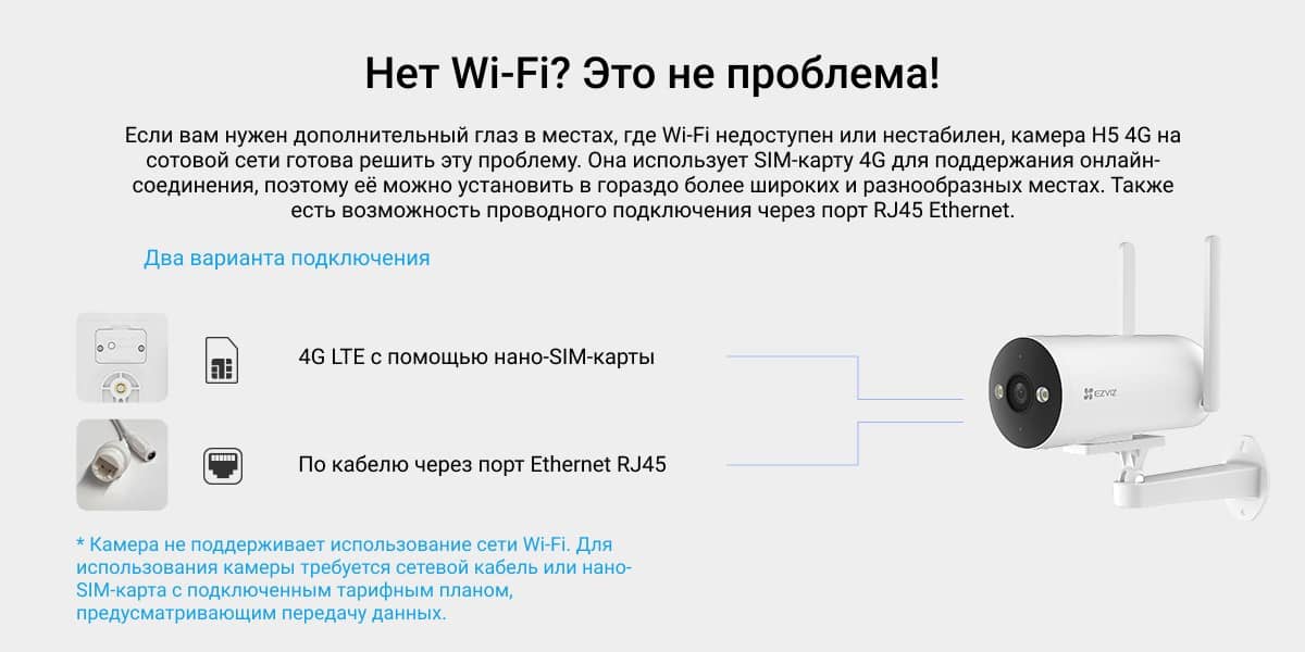 Камера EZVIZ H5 4G ориентирована на автономное наблюдения там, где Wi-Fi недоступен или ненадёжен: удалённые участки, временные площадки, объекты с мобильным покрытием. Устройство поддерживает подключение через 4G LTE и дополнительно оснащено сетевым RJ-45-портом, что обеспечивает гибкие варианты сетевого доступа.