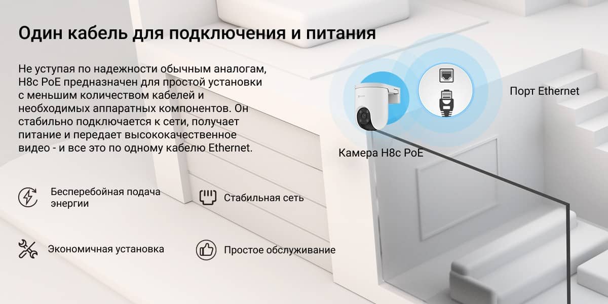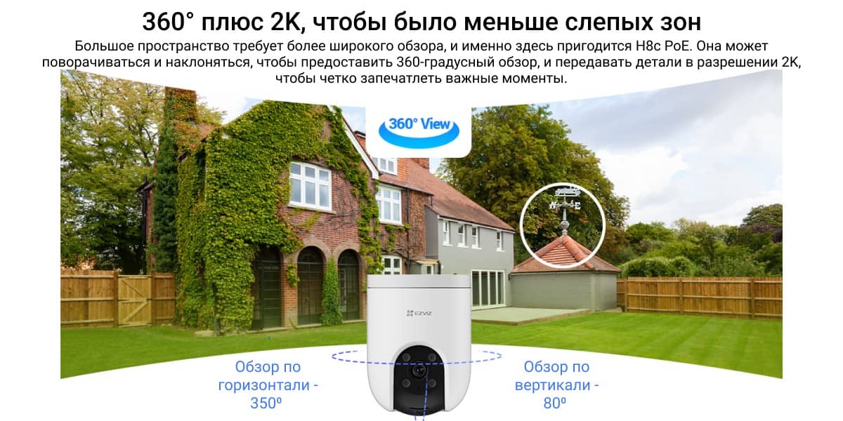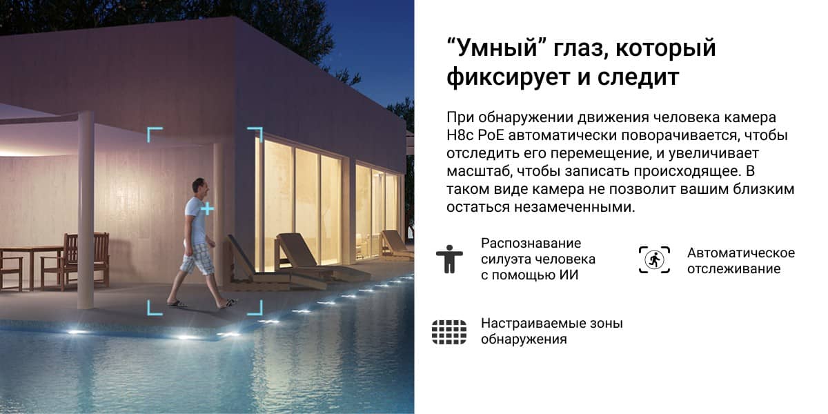 Охват 360°, надежное соединение. Камера H8c PoE, разработанная для повышения безопасности дома простым, но профессиональным способом, значительно снижает хлопоты, объединяя проводную сеть и источник питания в одном кабеле, упрощает долгосрочное обслуживание, обеспечивает лучшую масштабируемость и более низкую стоимость установки по сравнению с традиционными вариантами. Его моторизованный объектив поворачивается, чтобы захватить 360-градусный панорамный вид в ярком качестве 2K, не оставляя слепых зон в поле зрения. Кроме того, камера обнаруживает и отслеживает движущихся людей, а также эффективно отпугивает их благодаря встроенному искусственному интеллекту и функции активной защиты.