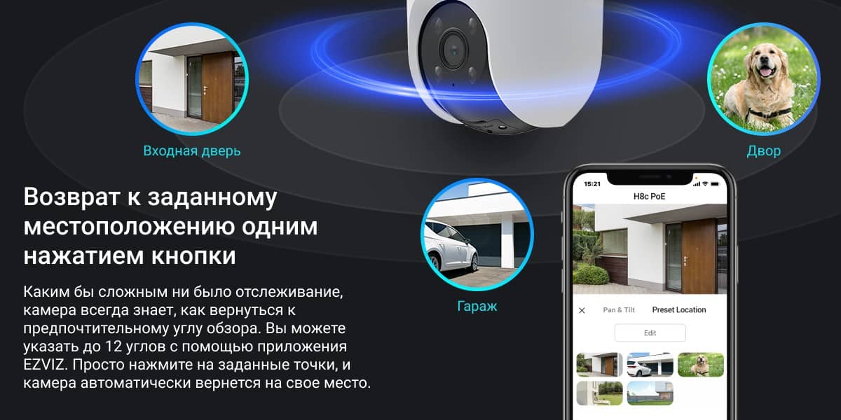 Позволяет одним кликом возвращаться к предварительно установленным позициям. Это ускоряет и упрощает контроль за ключевыми зонами и повышает эффективность мониторинга.