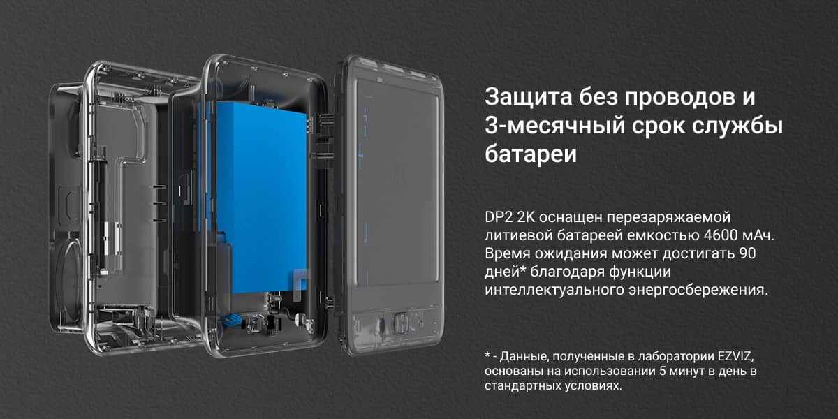 Питание — встроенный аккумулятор 4 600 мАч; при активном энергосбережении время в режиме ожидания достигает до 90 суток. Максимальное энергопотребление заявлено до 12 Вт при интенсивной работе. Для ночной съёмки доступен ИК-режим до 5 м, PIR-датчик обнаруживает человека на дистанции до 6 м; локальная запись поддерживается на microSD до 512 ГБ.