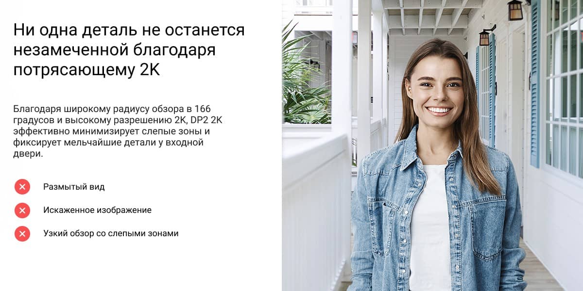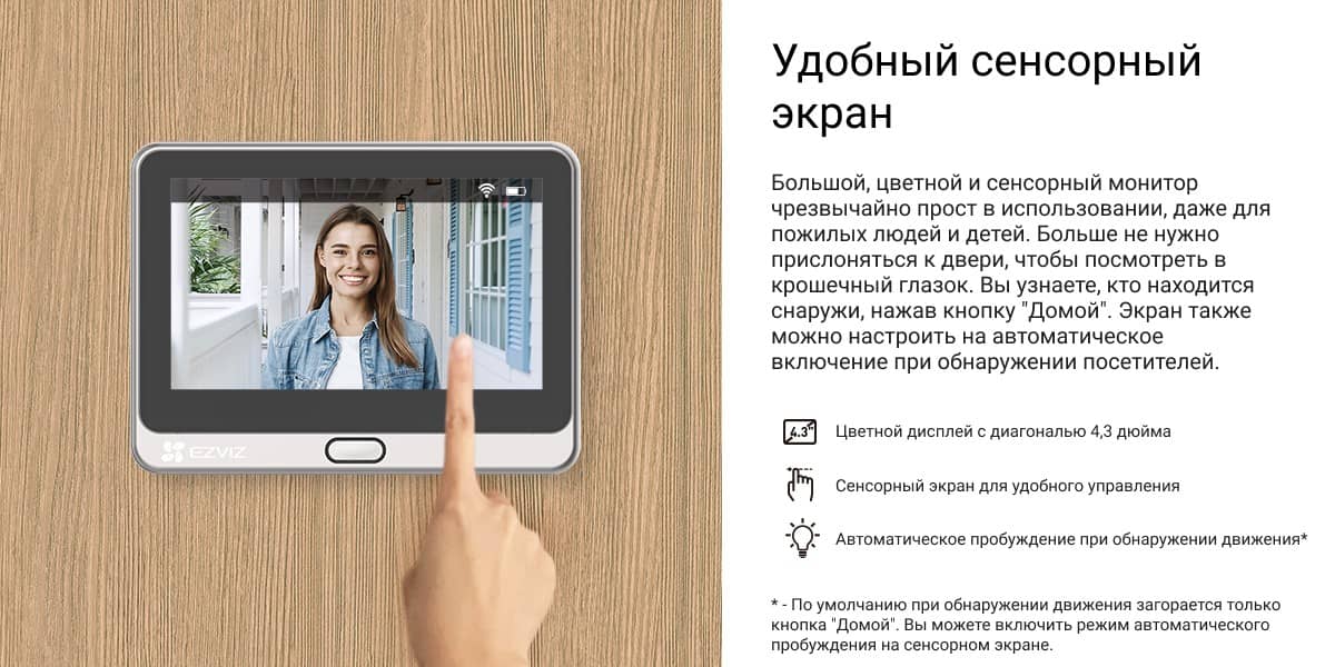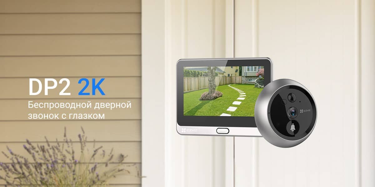 EZVIZ DP2 2K — беспроводной дверной видеоглазок с 4,3" цветным сенсорным экраном, рассчитанный на замену классического смотрового отверстия и постоянный контроль входной двери. Камера снимает в разрешении 2304×1296 (2K), угол обзора по диагонали 166° — охватывает весь подъездной сектор без «слепых зон», видео передаётся по Wi-Fi 2,4 ГГц на локальный монитор и приложение.