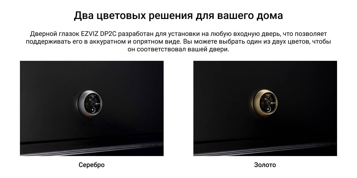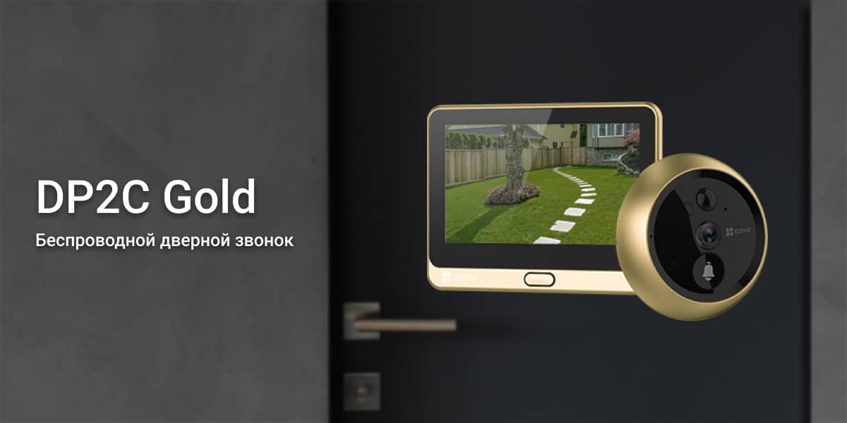 EZVIZ DP2C Gold — беспроводной видеоглазок в золотом цвете с экраном 4,3", спроектированный для контроля входной двери и замены традиционного смотрового глазка. Решение для тех, кому важно видеть, кто находится за дверью и при этом избежать кабельной разводки.