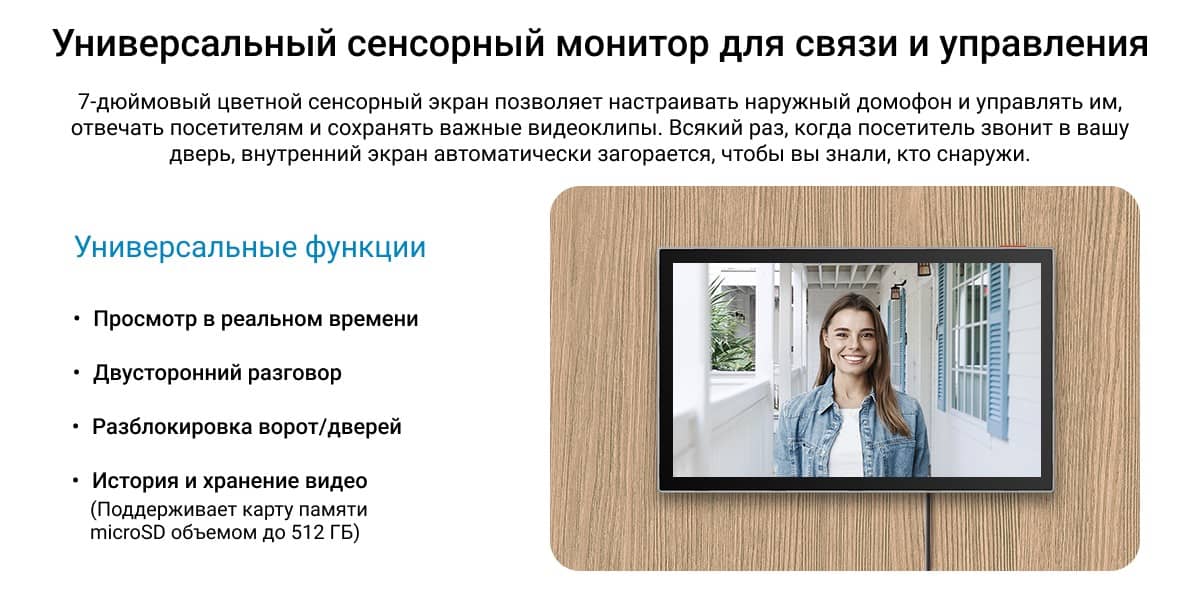 Внутренний блок оснащён 7-дюймовым цветным сенсорным экраном для живого просмотра и управления; система поддерживает двустороннюю аудиосвязь, удалённую разблокировку двери и калитки, и работу с RFID-метками. Набор функций, которые востребованы при замене стационарных домофонов в частных домах и малоэтажной застройке.