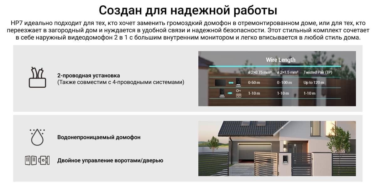 HP7 фокусируется на трёх вещах: широкий угол и разрешение для минимизации «слепых зон», встроенный монитор для мгновенного локального контроля без постоянного обращения к смартфону, и совместимость с существующей проводкой для упрощения монтажа. Эти свойства делают HP7 практичным выбором при замене стационарных домофонов в реальных условиях эксплуатации.