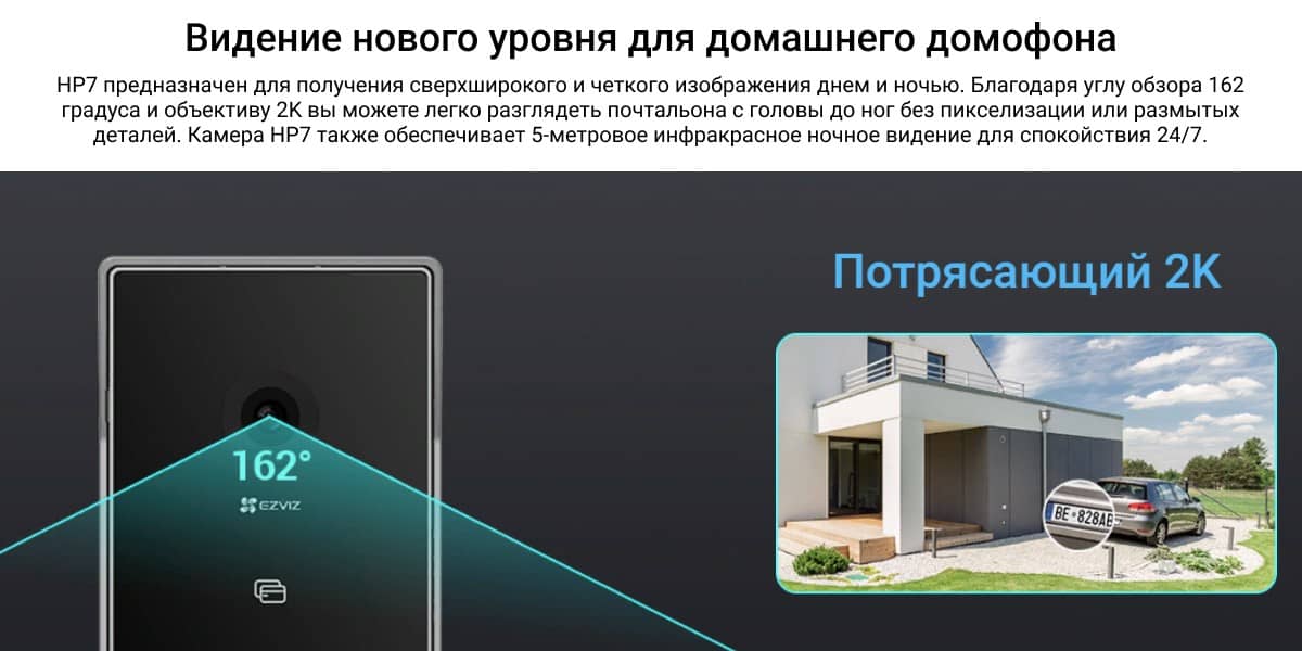 EZVIZ HP7 — видеодомофон с большим сенсорным экраном и 2K-камерой, спроектированный для полноценного контроля входной зоны. Разрешение 2048×1296, сенсор 1/2.7" Progressive CMOS, объектив 2,0 мм при светосиле F2.2, диагональный угол обзора 162°. Эти параметры дают широкий охват подъезда и достаточную детализацию для идентификации посетителя с близкой дистанции.